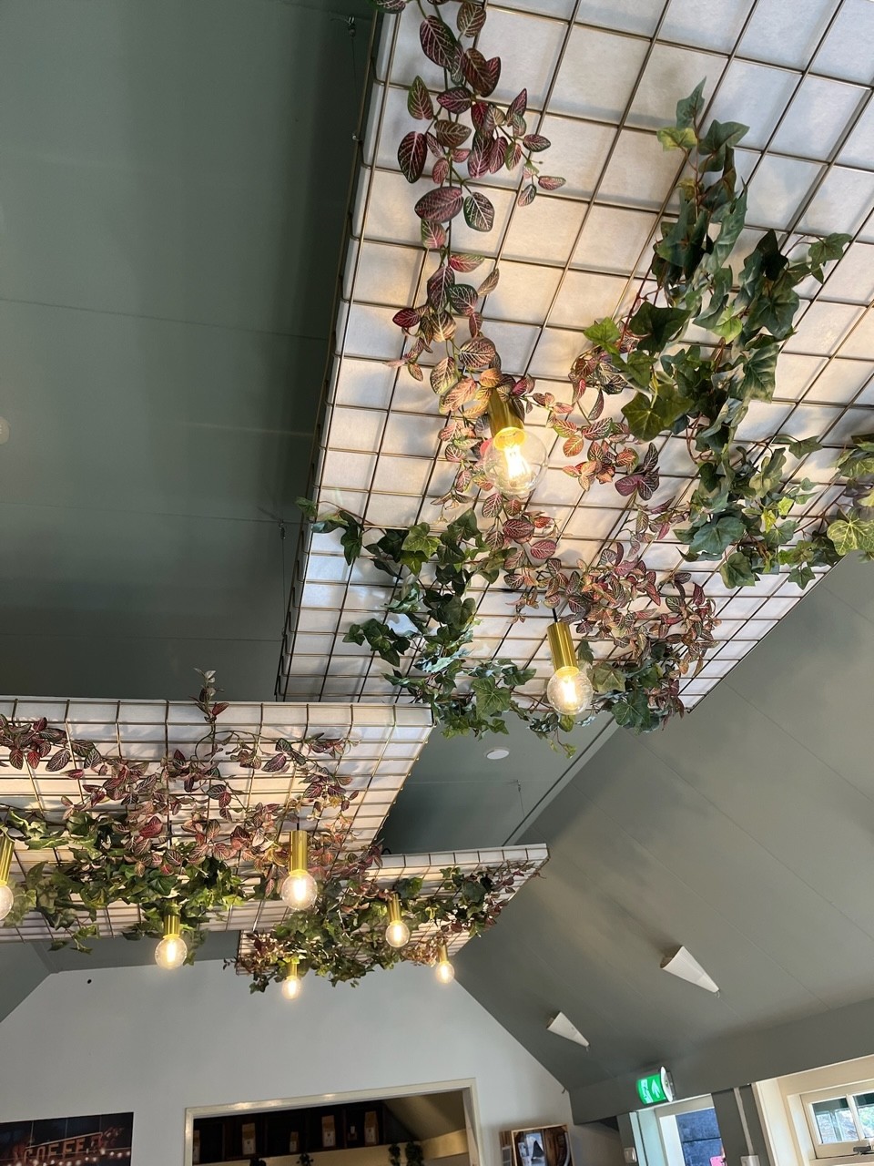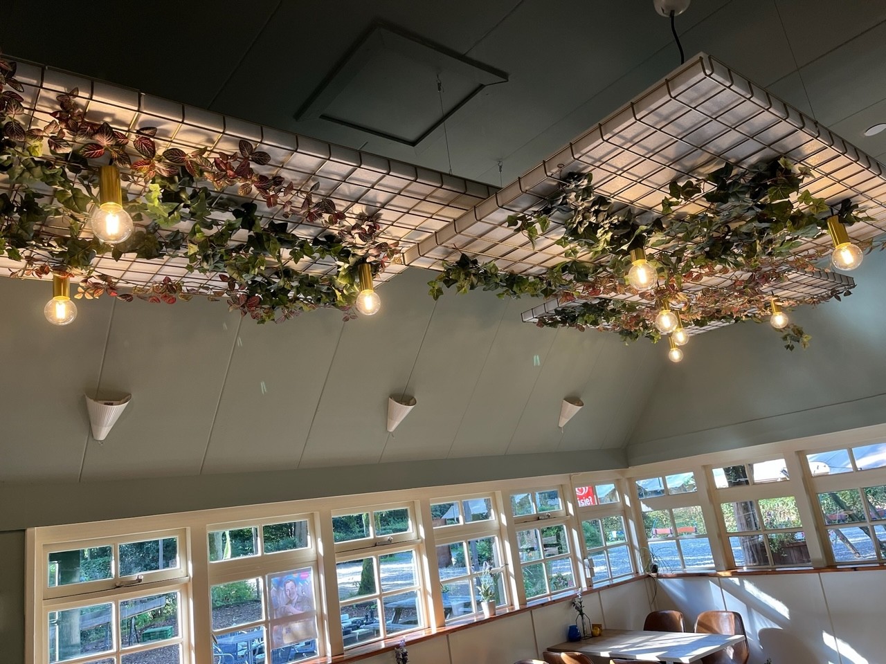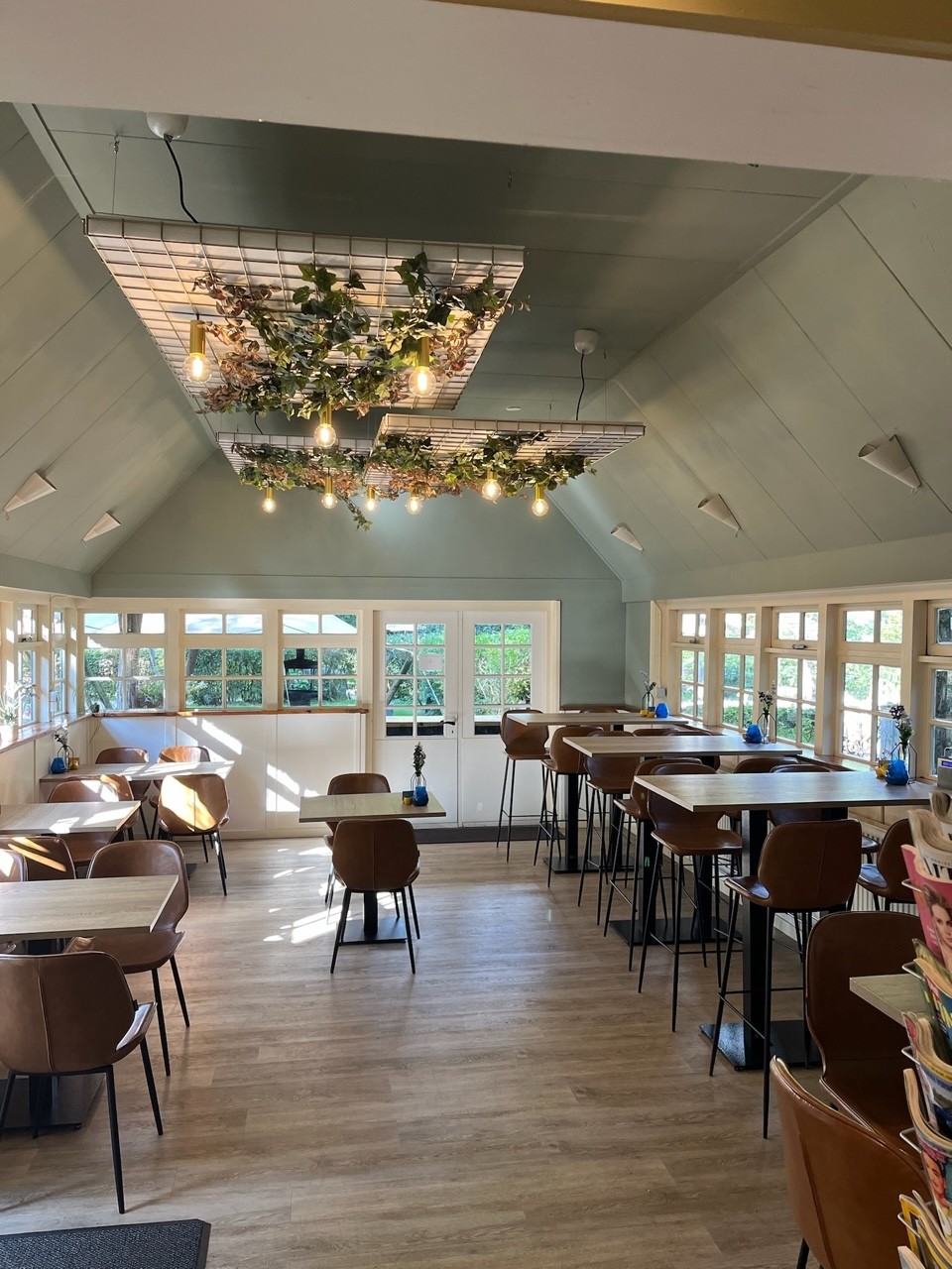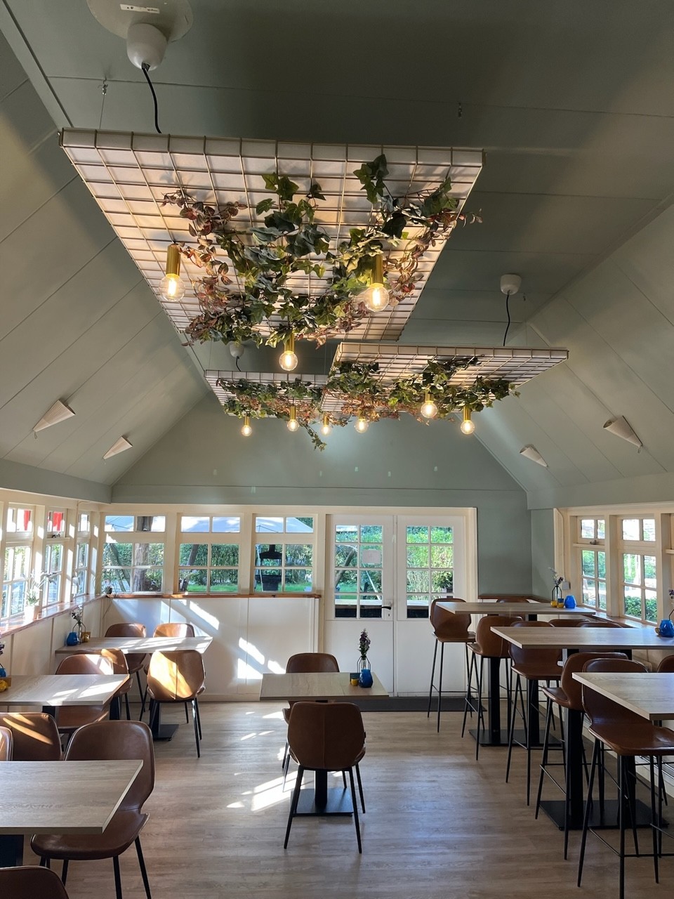 Bij het Koffiehuys Gooise heide hebben we met succes het akoestiekprobleem aangepakt door gebruik te maken van 3 Off The Grid-panelen. Deze panelen zijn zorgvuldig geïntegreerd in een elegant nikkel raamwerk, waarbij niet alleen aandacht is besteed aan functionaliteit, maar ook aan esthetiek. De toevoeging van sfeerverlichting en kunsthangplanten draagt bij aan een harmonieuze en gezellige sfeer.