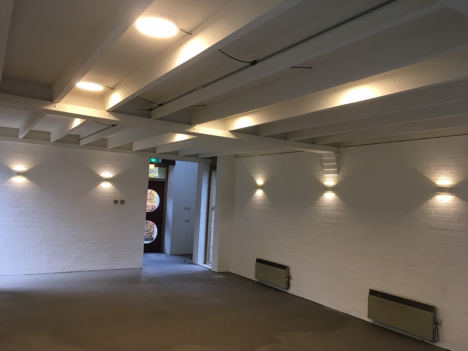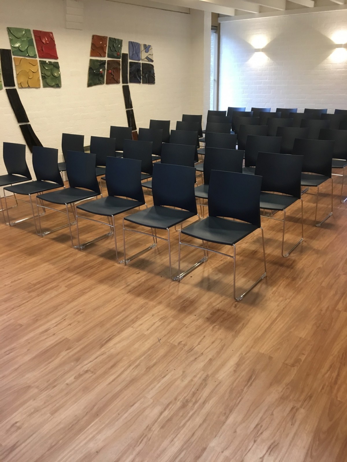 Gehele aula gemodeniseerd. De aula is voorzien van een PVC strokenvloer. Aan de wand up en down Led wandverlichting die in breedtes is aan te passen. Aan het plafond ronde Led lampen. De stoelen zijn van FP collection uitgevoerd in een kunststof kuip, die makkelijk stapelbaar zijn