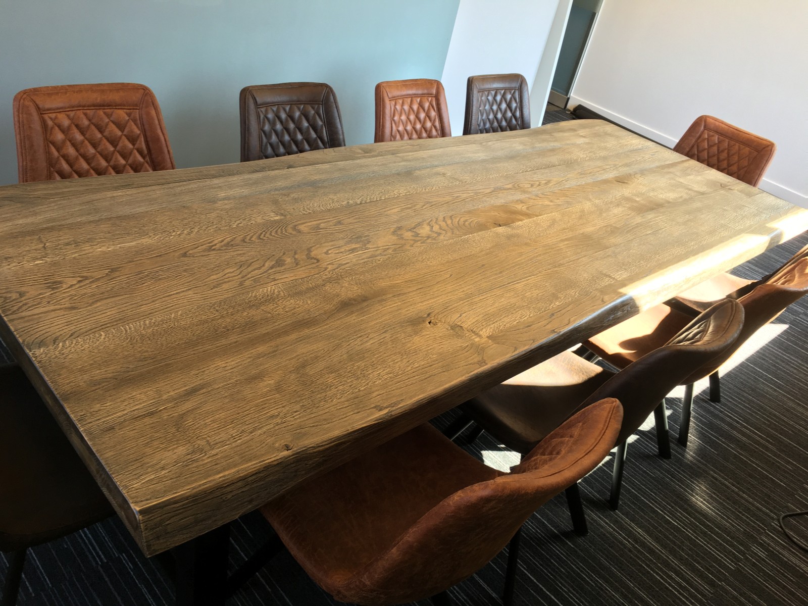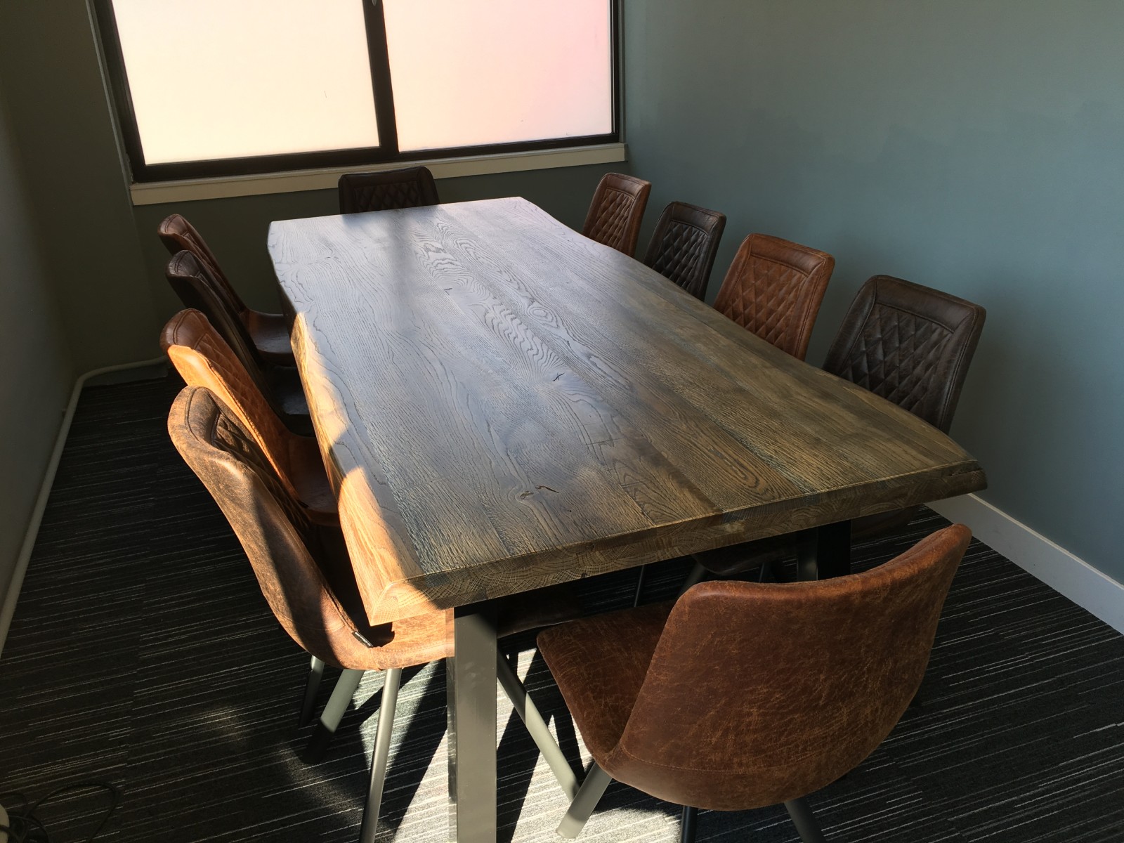 In de vergaderruimte een robuuste boomstam tafel geplaatst met luxe lederen stoelen.