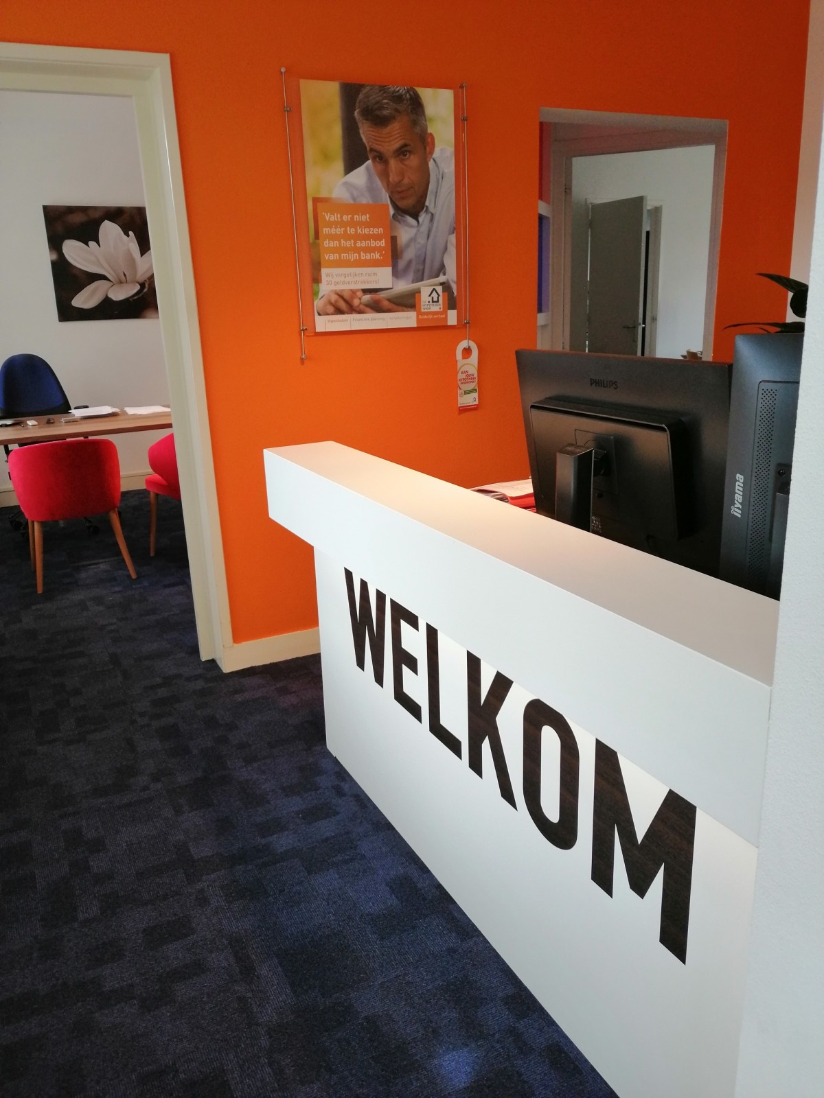 Bij deze klant de open receptie veranderd doormiddel van een baliewand met LED verlichting. Achter de balie een in elektrische hoogte verstelbaar bureau geplaatst. De gehele hypotheekshop is voorzien van blauwe vloertegels van Desso, in de spreekkamer en wachtruimte 4 fauteuiltjes in een frisse kleur.