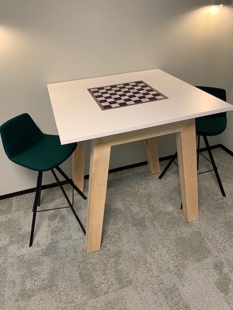 Op de Hybridtafel in de wachtruimte hebben we een schaakbord geplakt om even te ontspannen.